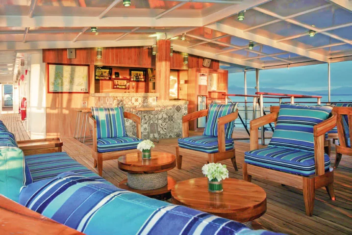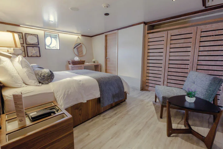 The Evolution Cruise Ship has an intimate feel and is tastefully designed. Accommodating up to 32 passengers with 14 cabins and 4 suites, all with air-conditioning and private facilities, this is an elegant ship for your Galapagos adventure.
