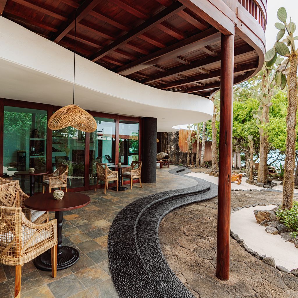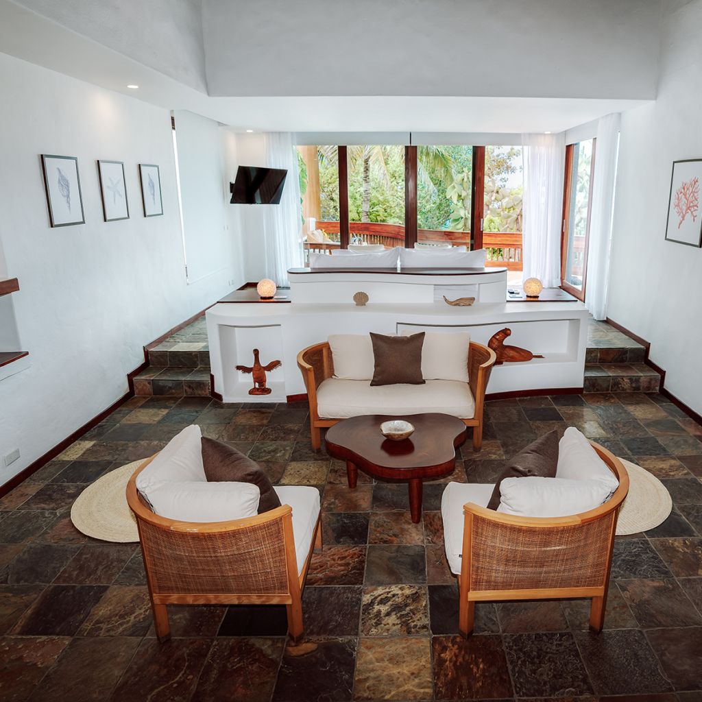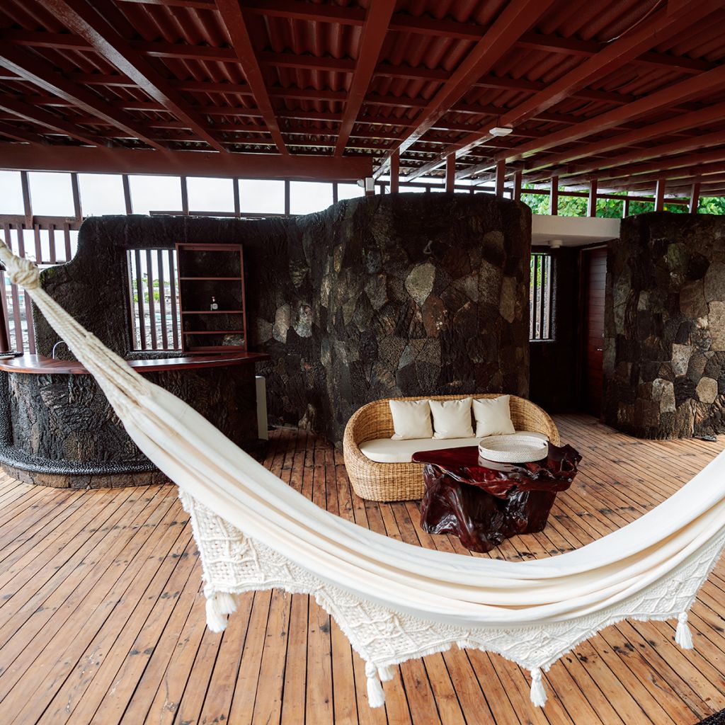 It has an infinity pool and a jacuzzi, both facing the sea next to which there is a very large bar, tables and places to rest under the roof, or outdoors to sunbathe, hammocks next to giant palm trees and arrayanes; and in the environment sea lions, turtles, manta rays and other marine species circulate.