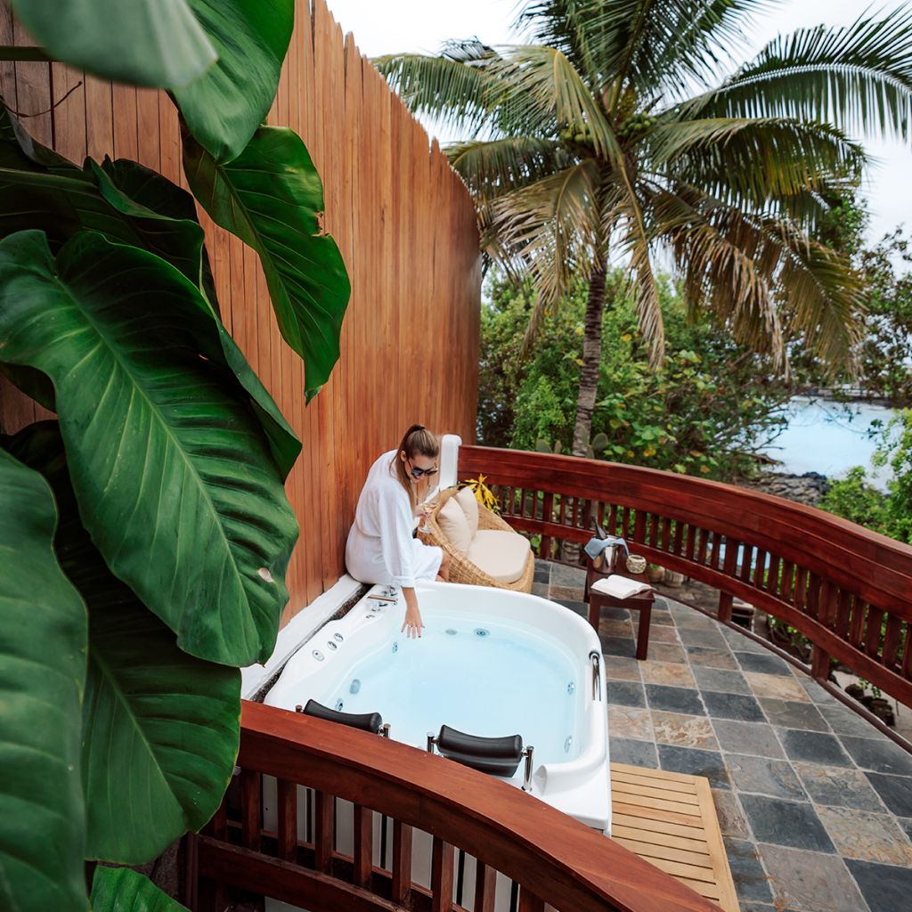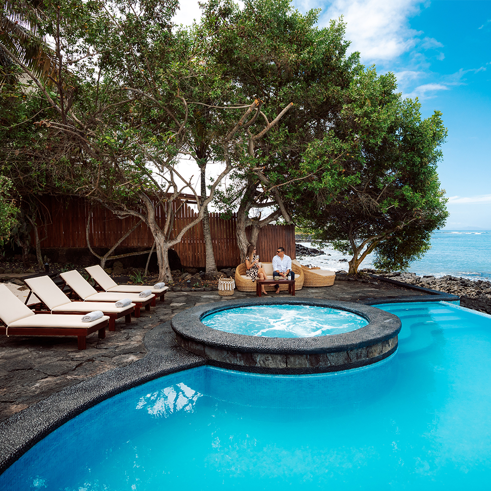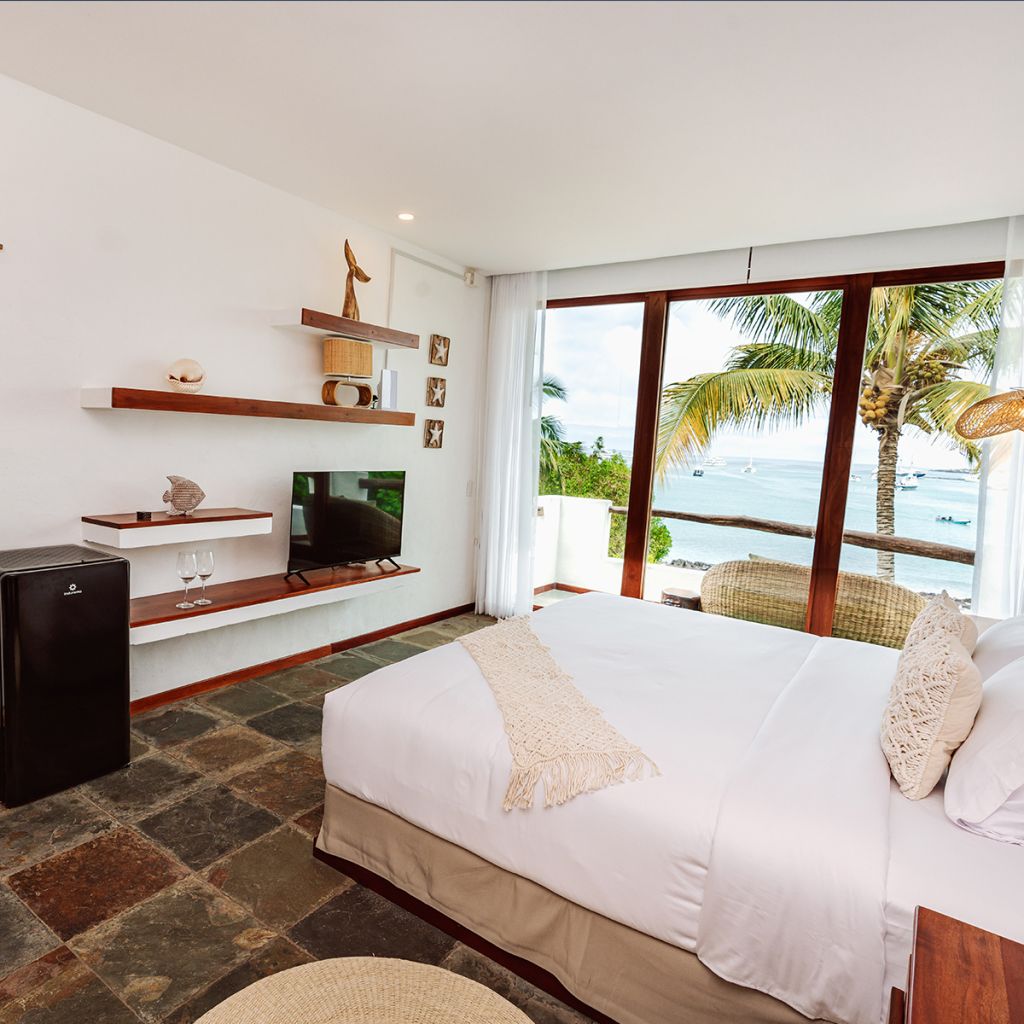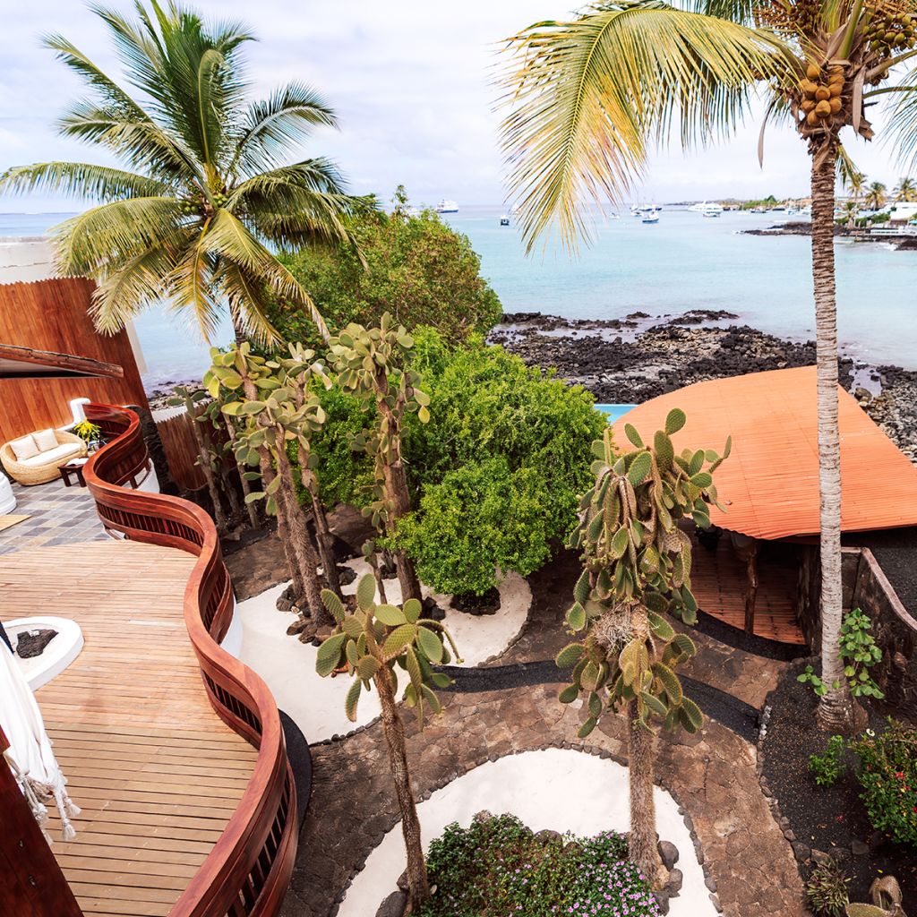 It has an infinity pool and a jacuzzi, both facing the sea next to which there is a very large bar, tables and places to rest under the roof, or outdoors to sunbathe, hammocks next to giant palm trees and arrayanes; and in the environment sea lions, turtles, manta rays and other marine species circulate.